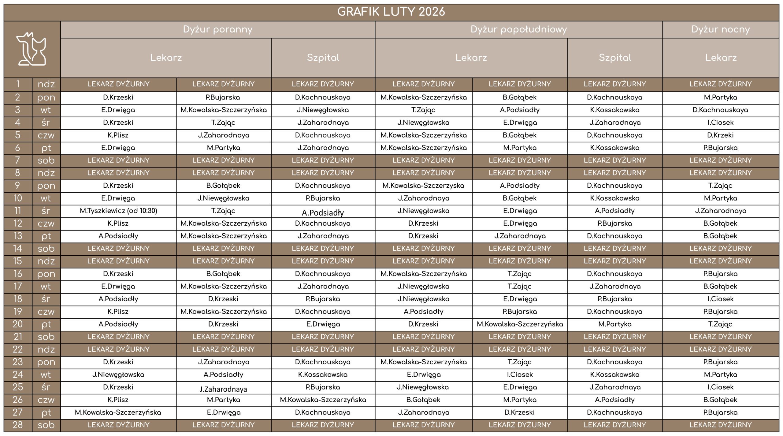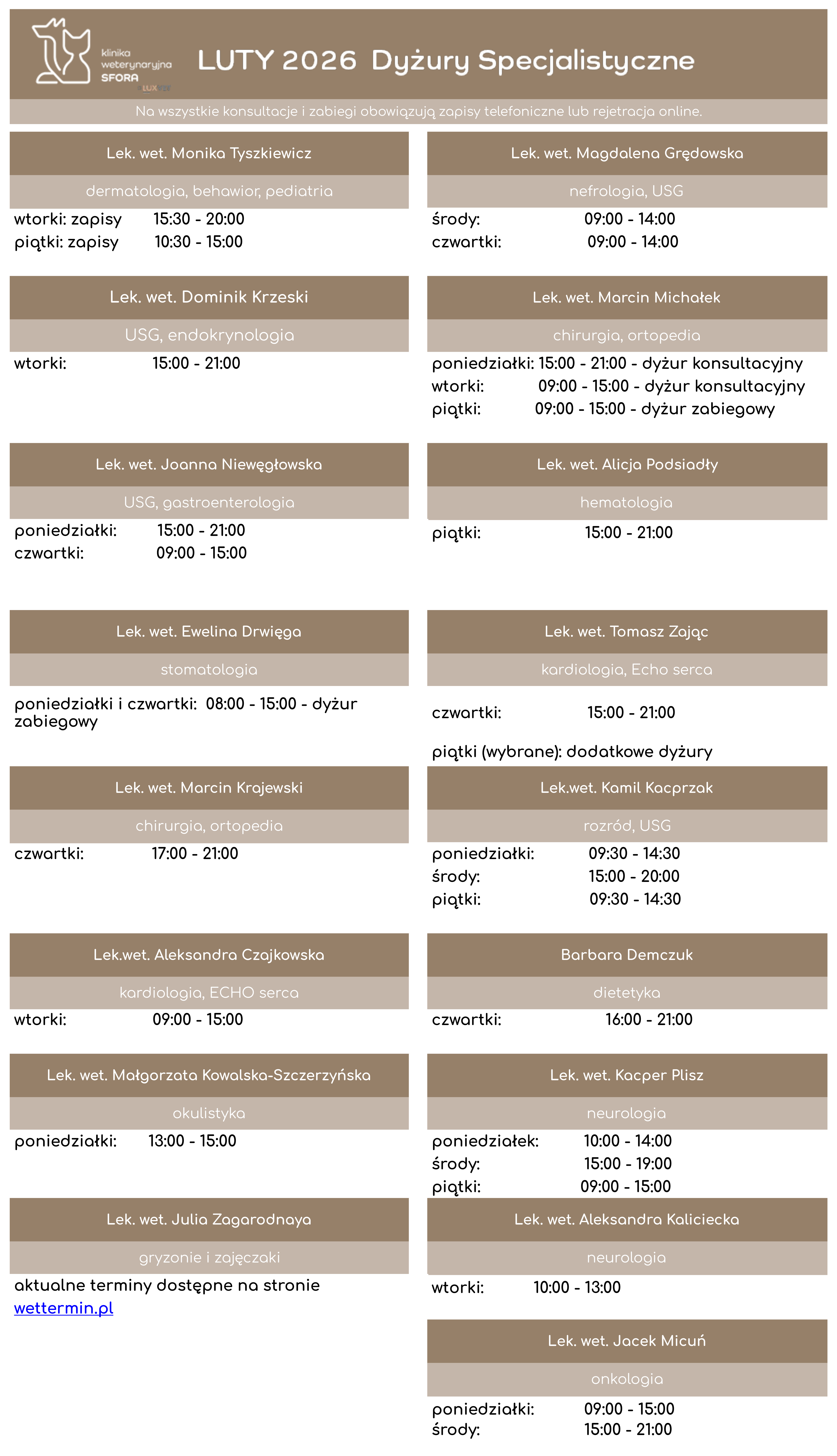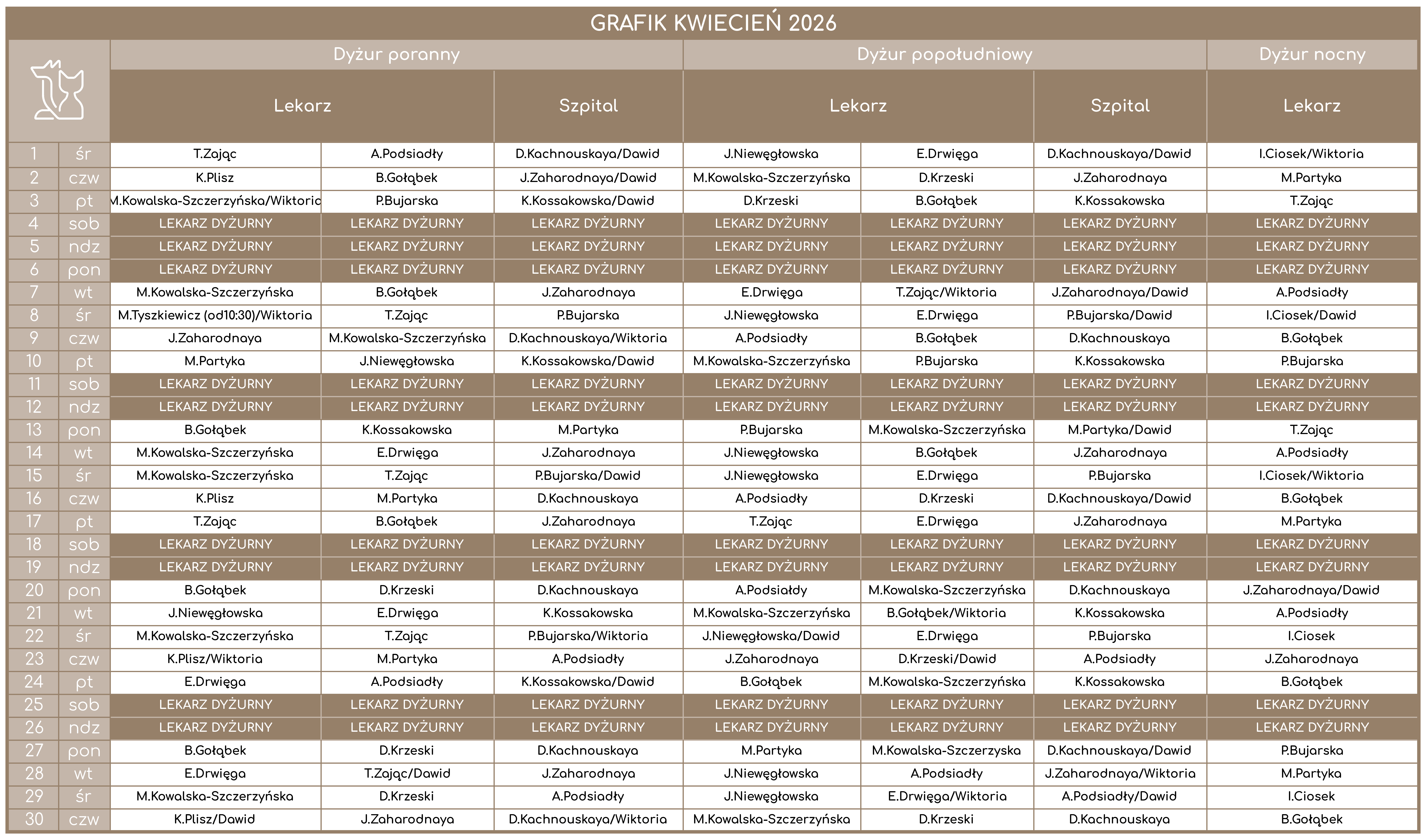 Codziennie na dyżurze przyjmuje dwóch lekarzy internistów i lekarz szpitalny, którzy zgodnie z kolejnością lub w zależności od stanu pacjenta zapraszają do gabinetów. Na dyżurach internistycznych nie ma możliwości zapisu, te odbywają się do lekarzy na dyżurach konsultacyjnych. Ponadto każdy z lekarzy internistów poza obszerną wiedzą ogólną ma również swoją specjalizację – taką jak ultrasonografia, dermatologia czy okulistyka. Posiadamy niezbędny sprzęt do pełnej diagnostyki, dużą część badań laboratoryjnych wykonujemy na miejscu.